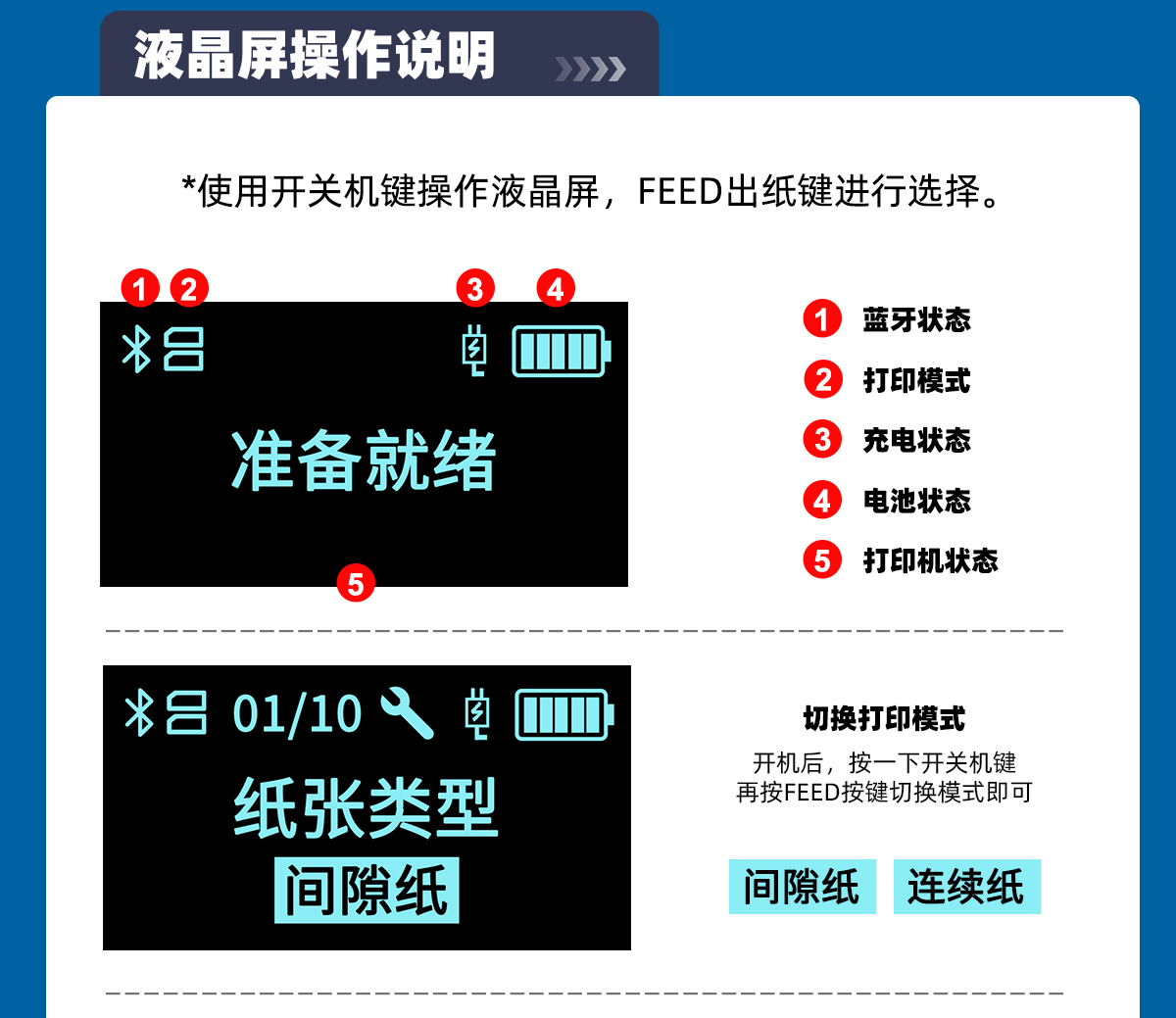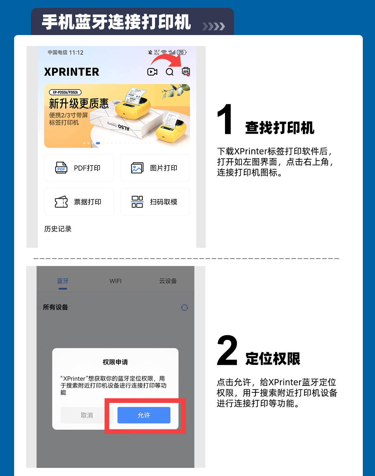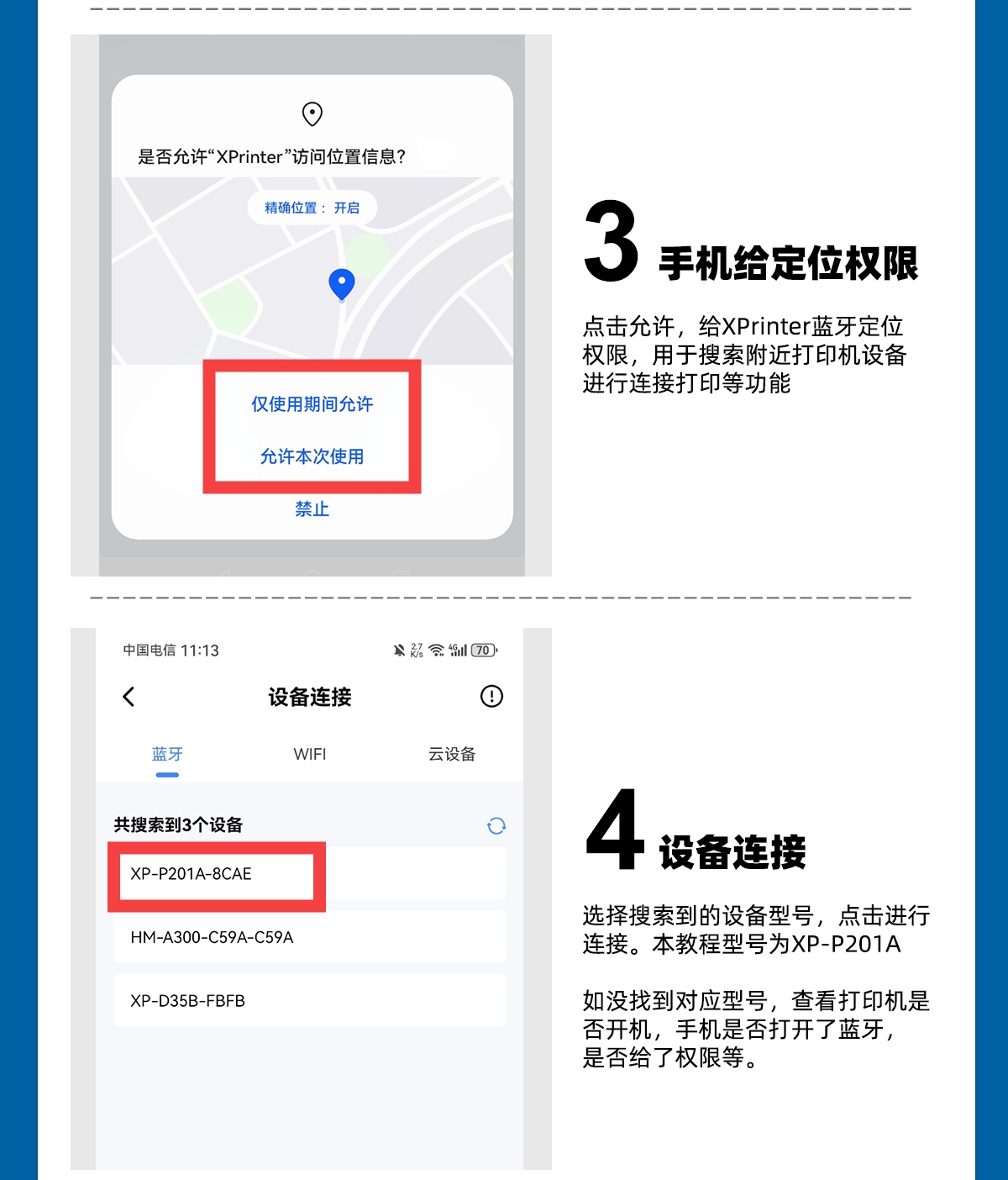 | 1.店内所有含有蓝牙功能的产品,连接前请打开手机定位功能,以便您能更快的连接打印机。 2.【标签+面单打印机】支持1台安卓+1台苹果。(同时连接,部分机型,仅支持1台安卓或1台苹果) 3.【小票机】可以同时连接6台安卓+1台苹果手机。(部分机型,仅支持1台安卓或1台苹果) 4.使用机器过程中,可能会出现蓝牙打印机自动断开的情况,可能是因为【外卖商家版软件】后台被杀掉,以及软件权限没有设置好。 | ||