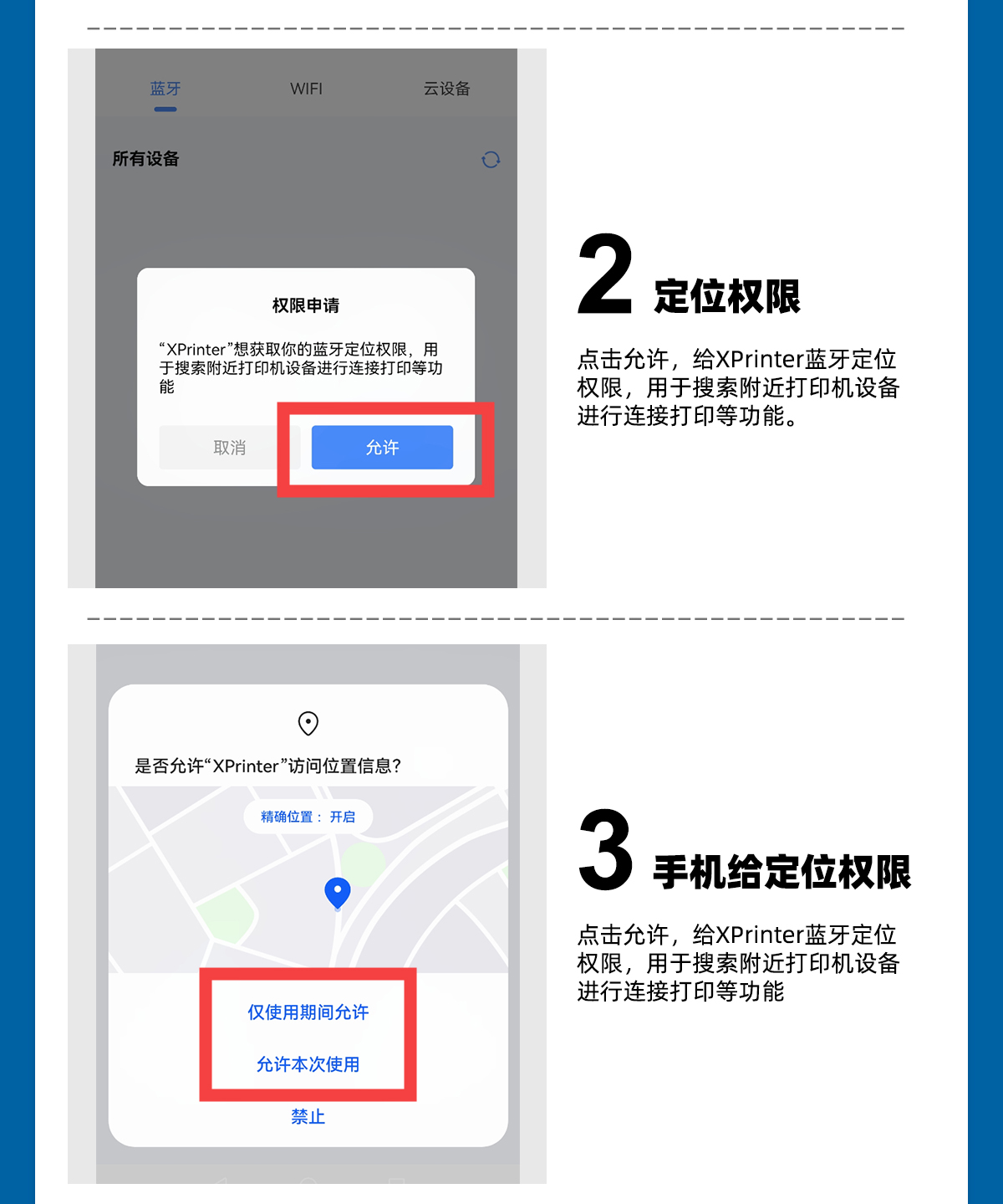 | 1.店内所有含有蓝牙功能的产品,连接前请打开手机定位功能,以便您能更快的连接打印机。 2.【标签+面单打印机】支持1台安卓+1台苹果。(同时连接,部分机型,仅支持1台安卓或1台苹果) 3.【小票机】可以同时连接6台安卓+1台苹果手机。(部分机型,仅支持1台安卓或1台苹果) 4.使用机器过程中,可能会出现蓝牙打印机自动断开的情况,可能是因为【外卖商家版软件】后台被杀掉,以及软件权限没有设置好。 | ||