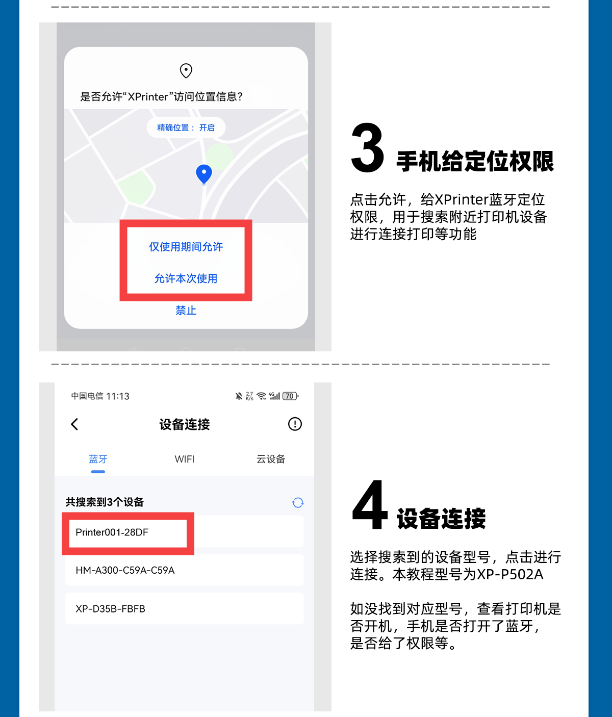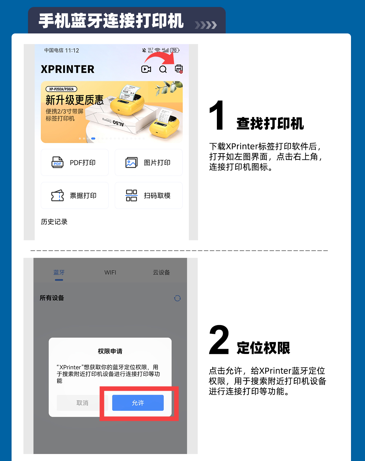 | 1.店内所有含有蓝牙功能的产品,连接前请打开手机定位功能,以便您能更快的连接打印机。 2.【标签+面单打印机】支持1台安卓+1台苹果。(同时连接,部分机型,仅支持1台安卓或1台苹果) 3.【小票机】可以同时连接6台安卓+1台苹果手机。(部分机型,仅支持1台安卓或1台苹果) 4.使用机器过程中,可能会出现蓝牙打印机自动断开的情况,可能是因为【外卖商家版软件】后台被杀掉,以及软件权限没有设置好。 | ||